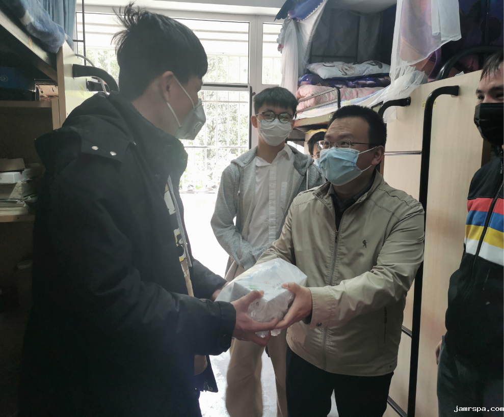 2020年4月24日中午,生物技术学院党委书记杨美成、团委书记钱平、辅导员王荃、邹金城深入毕业班学生宿舍,了解学生返校生活情况,特别是毕业设计、论文、考研复试调剂、就业等相关情况,并叮嘱学生疫情防控期间做好个人防护,不聚集,经常开窗通风,与导师、班主任、辅导员保持线上联系,积极配合后勤集团做好相关疫情防控措施,遵守防控工作相关制度。最后,杨美成书记代表学院给学生送上口罩、消毒棉片、洗手液等防护用品。