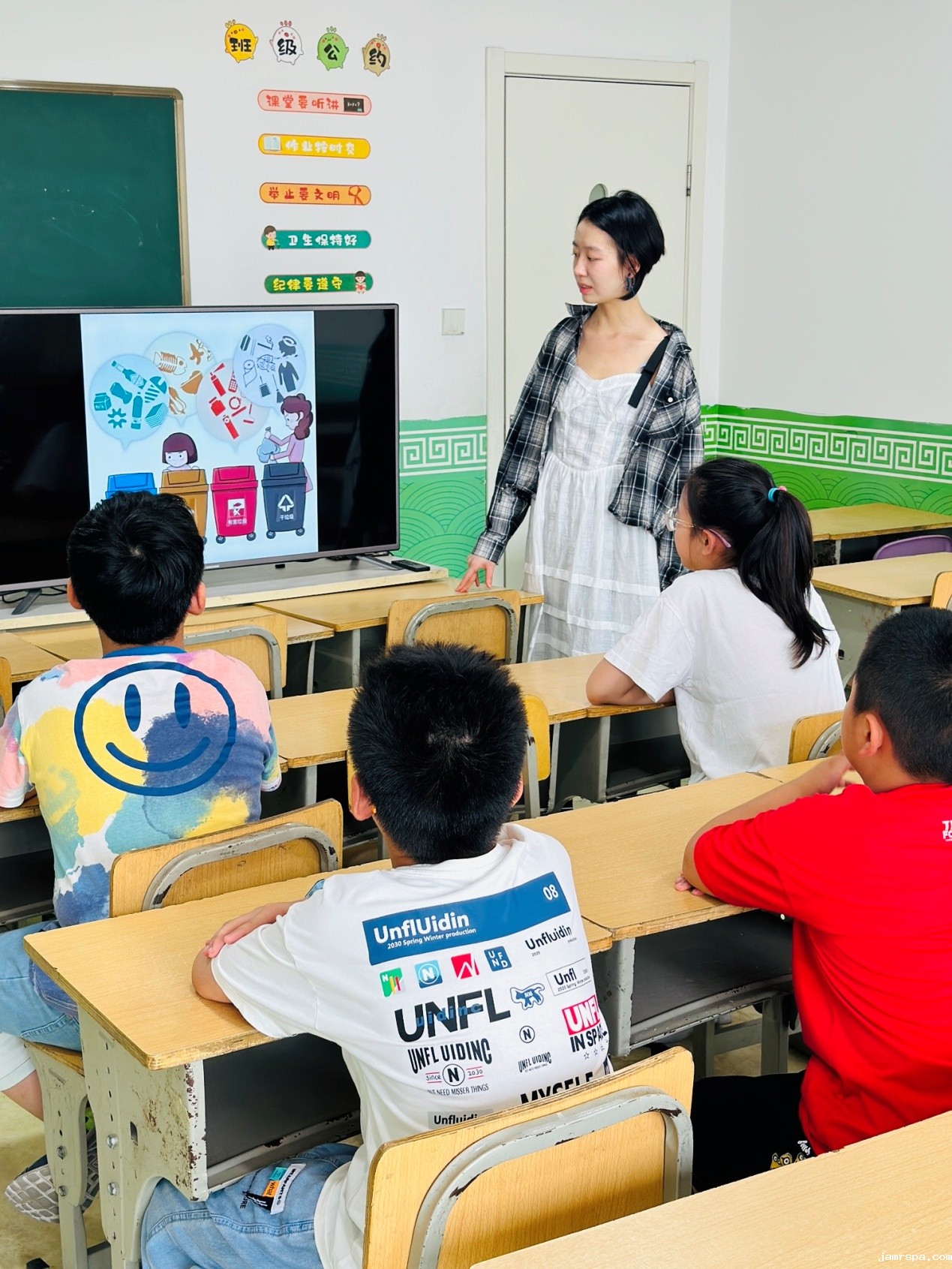 在扬州江都区爱心暑托班,志愿者梁川巧妙地采用生动有趣、寓教于乐的宣讲方式,通过展示图片、观看视频,有奖知识问答和游戏互动等形式向孩子们讲解垃圾的来源和危害、不同垃圾的正确处理方式,以及常见的需要分类的物品有哪些等知识,孩子们也解锁了正确投递垃圾的方式。课堂上气氛热烈,孩子们认真倾听,积极互动,收获颇丰。在孩子们掌握了垃圾分类的相关知识后,志愿者巧妙运用游戏活动对孩子们的积极影响,将垃圾分类的各类操作材料投放到区域中,孩子们自主参与,成功开启垃圾分类小达人之路。