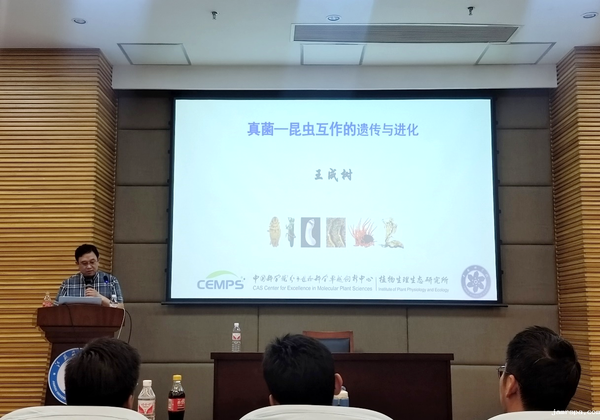 王成树研究员长期从事真菌—昆虫互作机理等研究。在本次报告中,王成树研究员主要介绍了虫生真菌基因组进化、杀虫毒力相关的基因功能以及真菌-体表微生物组-昆虫多重互作。首先,王成树研究员通过对虫生真菌基因组进化的研究,发现子囊菌类的杀虫真菌多次进化,同植物真菌的关系最近而非人类病原;随后,王成树研究员通过对真菌感染地方病和流行病的研究,发现环境应用真菌杀虫剂能够长期宿存,不影响当地种群及昆虫群落的安全性,并且不同昆虫具有识别杀虫真菌的行为防御能力;最后,王成树研究员指出真菌感染的不同阶段要采用不同的基因对策,需要从多重互作水平去理解真菌的杀虫效率。本次报告不仅有利于大家理解真菌—昆虫互作的遗传与进化,同时也为大家在自己的研究方向提供新的视角。