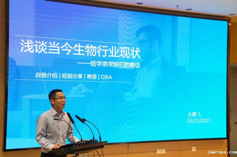 南京金斯瑞生物科技有限公司、生技学院优秀校友余鹏飞为学生做了“浅谈当今生物行业现状”的报告,回忆了自己的大学生活、分享了工作感悟、阐述了行业发展现状,寄语学弟学妹们要志存高远、努力奋斗!